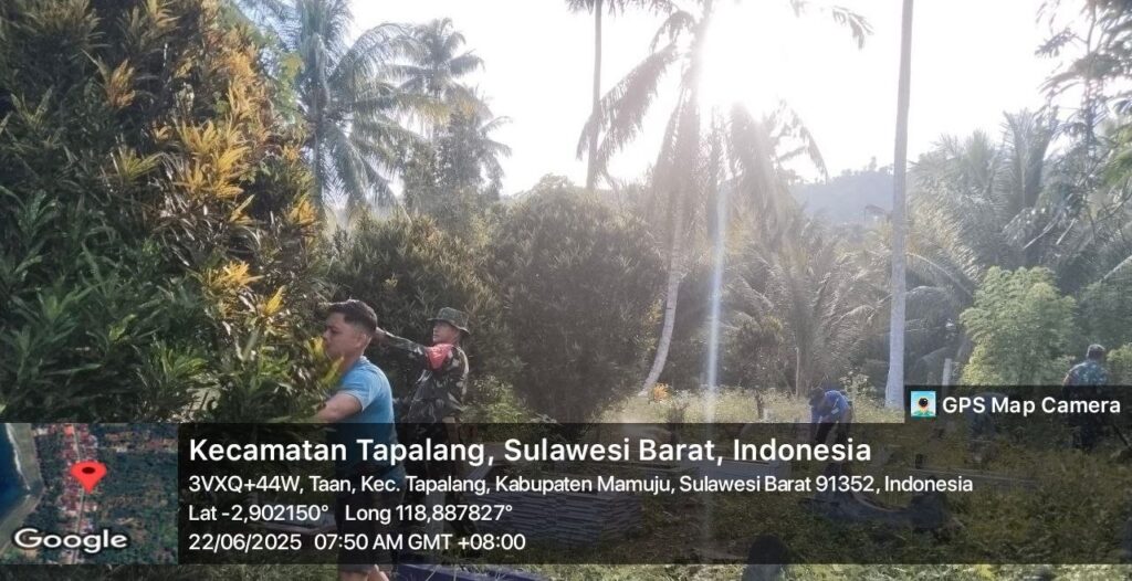 Mamuju, Potretrakyat.com; – Dalam upaya meningkatkan kesadaran masyarakat akan pentingnya menjaga kebersihan lingkungan, Babinsa Koramil 1418-02/Tapalang melaksanakan kegiatan karya bakti di Desa Taan, Kecamatan Tapalang, Kabupaten Mamuju. Minggu (22/6/2025).