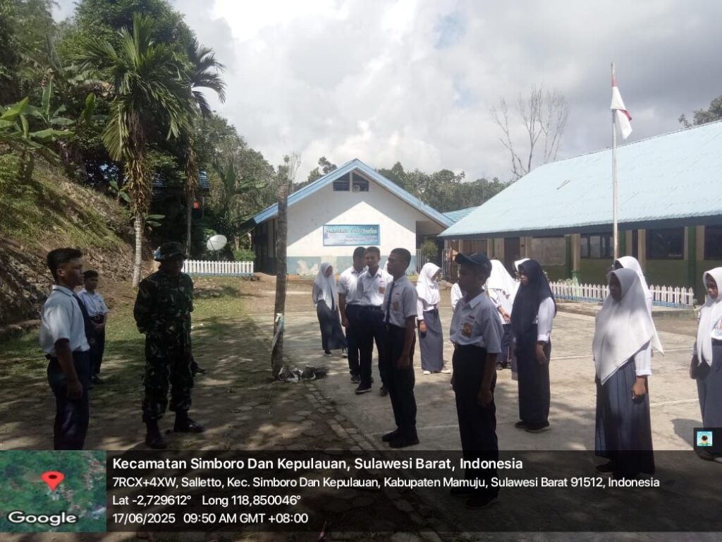 Mamuju, Potretrakyat.com; – Dalam rangka pembinaan wilayah dan menanamkan nilai-nilai kedisiplinan sejak usia dini, Babinsa Desa Saletto dari Koramil 1418-01/Mamuju melaksanakan kegiatan Pembinaan Ketahanan Wilayah (Bintahwil) dengan memberikan materi Peraturan Baris Berbaris (PBB) kepada para siswa di SMP Saletto, Kecamatan Simboro, Kabupaten Mamuju Tengah. Selasa (17/6/2025).