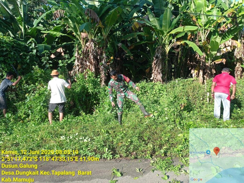 Mamuju, Potretrakyat.com; – Dalam upaya meningkatkan kesadaran masyarakat akan pentingnya menjaga kebersihan lingkungan, Babinsa Koramil 1418-02/Tapalang bersama warga Dusun Galung, Desa Dungkait, Kecamatan Tapalang Barat, Kabupaten Mamuju, melaksanakan kegiatan karya bakti pembersihan pinggir jalan, Kamis (12/6/2025).
