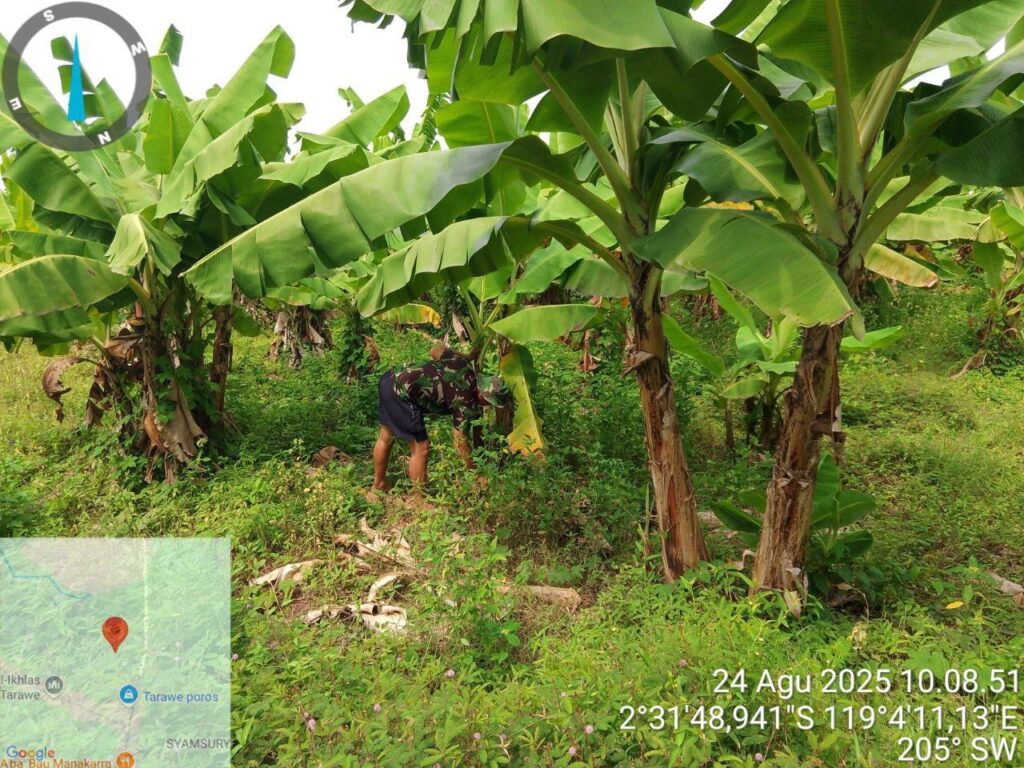 Mamuju, Potretrakyat.com; – Dalam rangka mendukung program ketahanan pangan nasional, Babinsa Koramil 1418-03/Kalukku melaksanakan kegiatan perawatan tanaman pisang cavendis dan pepaya di lahan Korem 142/Tatag yang di Kelola oleh Kodim 1418/Mamuju, tepatnya di Dusun Taraweh, Desa Beru-beru, Kecamatan Kalukku, Kabupaten Mamuju. Minggu (24/8/2025).