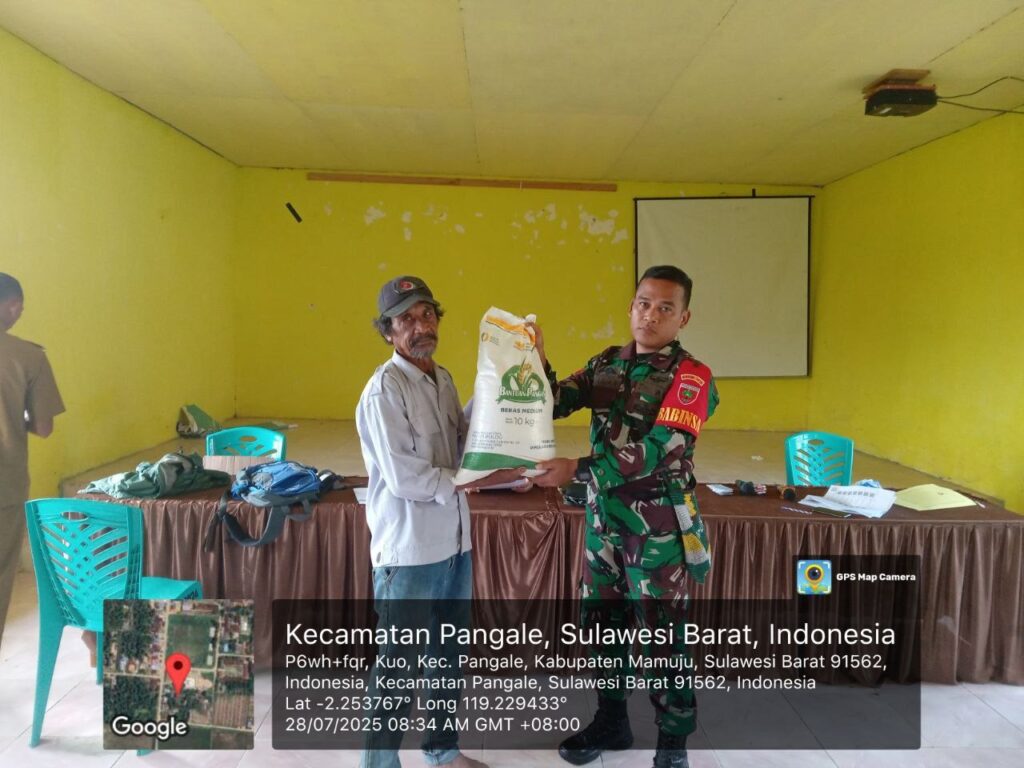 Mamuju Tengah, Potretrakyat.com; – Dalam rangka mendukung program pemerintah dalam menjaga ketahanan pangan dan membantu masyarakat yang membutuhkan, Babinsa Koramil 1418-04/Budong Budong, Koptu Saman, melaksanakan kegiatan Komunikasi Sosial (Komsos) sekaligus pendampingan penyaluran Bantuan Pangan (Ban Pan) di Desa Kuo, Kecamatan Pangale, Kabupaten Mamuju Tengah. Selasa (29/7/2025).
