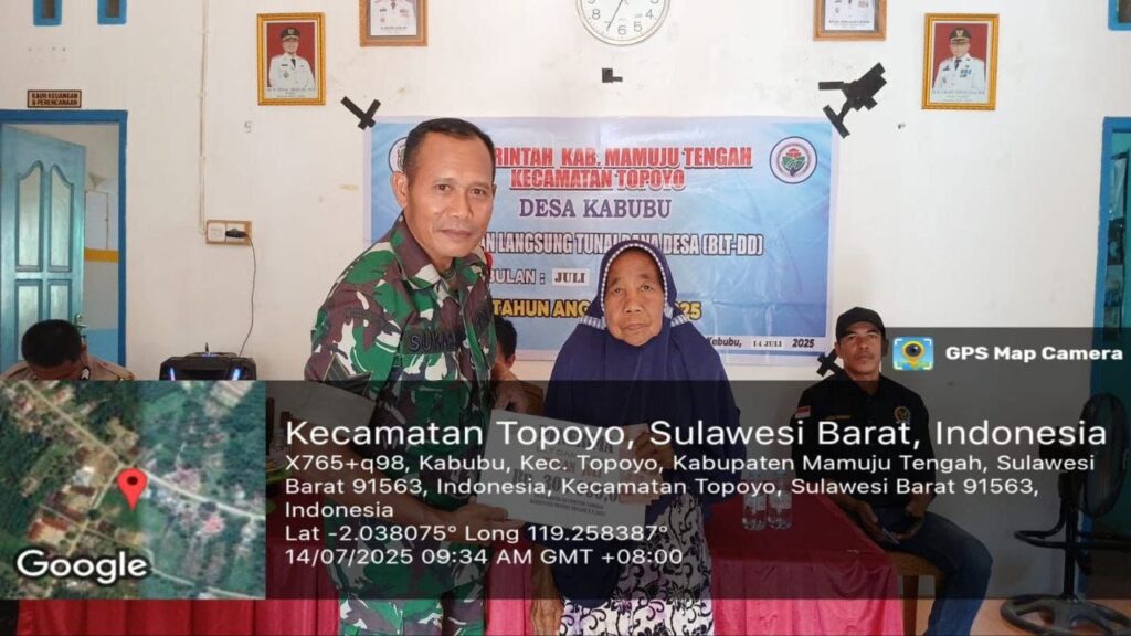 Mamuju Tengah, Potretrakyat.com; – Dalam rangka menjalankan tugas pembinaan teritorial sekaligus mempererat komunikasi sosial (Komsos) dengan masyarakat, Babinsa Koramil 1418-04/Budong-Budong, Serma Sukarji, turut hadir dan mengawal proses penyaluran dana Bantuan Langsung Tunai (BLT) kepada warga Desa Kabubu, Kecamatan Budong-Budong, Kabupaten Mamuju Tengah. Senin (14/7/2025).