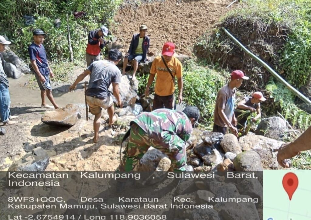 Mamuju, Potretrakyat.com; – Bintara Pembina Desa (Babinsa) dari Koramil 1418-05/Kalumpang, menunjukkan dedikasi tinggi dalam membantu masyarakat. Ia terjun langsung memperbaiki jalan tani yang terhambat akibat sungai kecil yang memotong akses di Desa Karataun, Kecamatan Kalumpang, Kabupaten Mamuju. Rabu (3/9/2025).