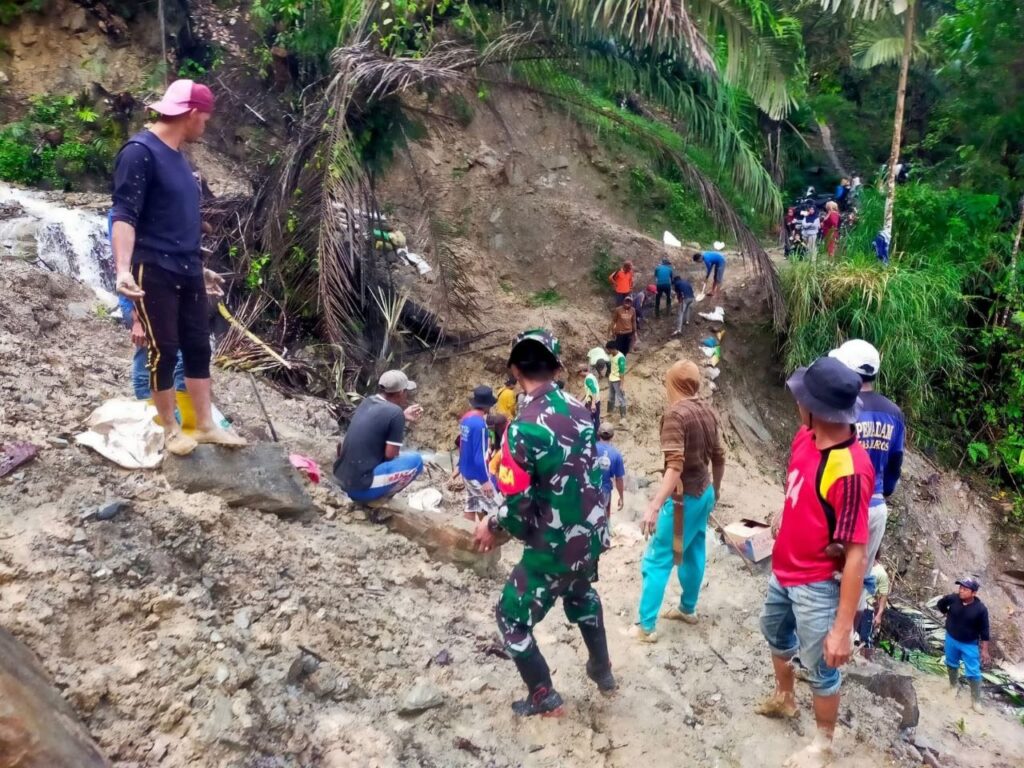 Babinsa Koramil 1418-05/Kalumpang Bantu Warga Perbaiki Jalan Perkebunan
