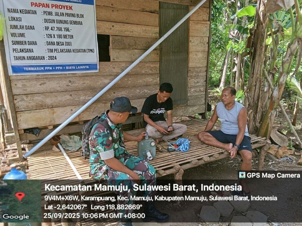 Mamuju, Potretrakyat.com; – Babinsa Koramil 1418-01/Mamuju, Kopda Abd. Rauf, melaksanakan kegiatan pembinaan wilayah yang dilanjutkan dengan komunikasi sosial (Komsos) bersama masyarakat di Dusun Ujung Bulo Wisata, Desa Karampuang, Kecamatan Mamuju, Kabupaten Mamuju, Kamis (25/9/2025).