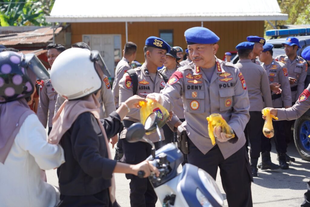 Mamuju, Potretrakyat.com; – Dalam program Inspiratif DitPolairud Polda Sulbar yaitu berbagi ikan segar kepada masyarakat di bulan suci Ramadhan, Kapolda Sulbar Irjen Pol Adang Ginanjar didampingi langsung DirPolairud Deny Pudjianto nampak begitu antusias membagikan ikan segar kepada masyarakat yang melintas di simpang lima kali Mamuju, Jumat (14/3/25).