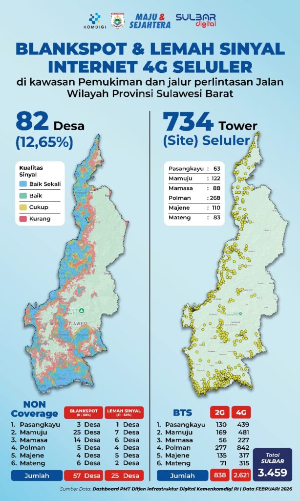 Berdasarkan Dashboard PMT Ditjen Infrastruktur Digital Kemenkomdigi RI per Februari 2026, masih terdapat 82 desa atau 12,65 persen wilayah Sulbar yang berada pada kondisi non coverage, terdiri atas 57 desa blankspot dan 25 desa dengan sinyal lemah.