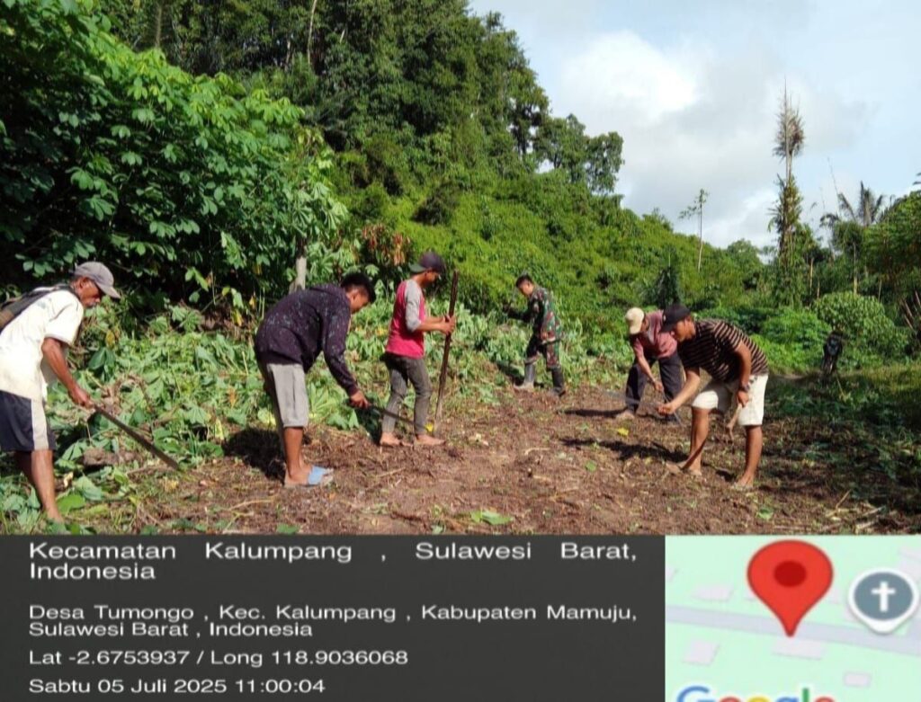 Mamuju, Potretrakyat.com; – Dalam upaya mendukung kelancaran akses transportasi masyarakat menuju lahan pertanian, personel Koramil 1418-05/Kalumpang melaksanakan kegiatan karya bakti pembersihan jalan tani di Desa Tumoga, Kecamatan Kalumpang, Kabupaten Mamuju, Sabtu (05/07/2025).
