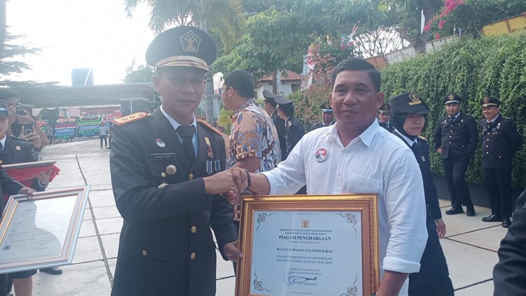 Mamuju, Potretrakyat.com; – Organisasi Kewartawanan lokal Ikatan Jurnalis Sulawesi Barat (IJS) menerima piagam penghargaan dari Kantor Wilayah Kementrian Hukum Republik Indonesia (KEMENKUM-RI) Sulawesi Barat (Sulbar), Jumat, 22 Agustus 2025.