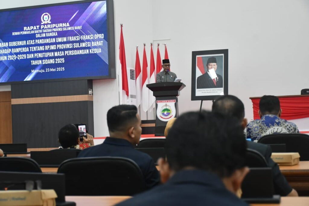 Mamuju, Potretrakyat.com; – Dewan Perwakilan Rakyat Daerah (DPRD) Provinsi Sulawesi Barat (Sulbar) menyetujui jawaban Gubernur atas pandangan umum fraksi-fraksi terkait Rancangan Peraturan Daerah (Ranperda) tentang Rencana Pembangunan Jangka Menengah Daerah (RPJMD) Sulbar Tahun 2025–2029.