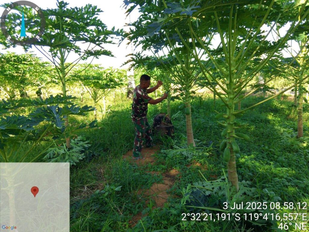 Mamuju, Potretrakyat.com; – Dalam rangka mendukung program ketahanan pangan nasional, personel Koramil 1418-03/Kalukku melaksanakan kegiatan perawatan tanaman pisang Cavendish dan pepaya yang ditanam di lahan Kodim 1418/Mamuju yang berlokasi di Dusun Taraweh, Desa Beru-beru, Kecamatan Kalukku, Kabupaten Mamuju. Kamis (3/7/2025).