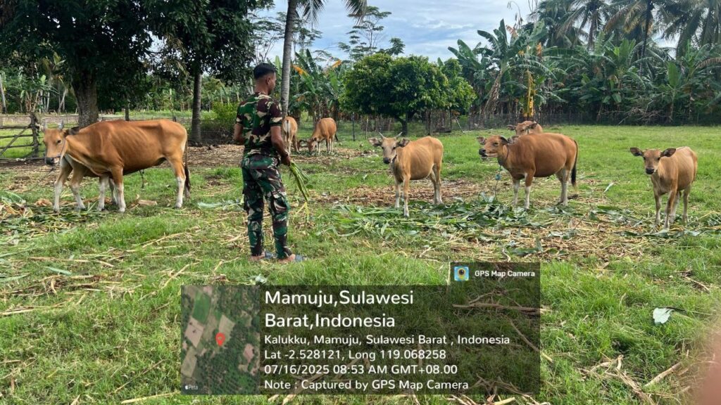 Mamuju, Potretrakyat.com; –Dalam rangka mendukung program ketahanan pangan nasional, personel Koramil 1418-03/Kalukku melaksanakan kegiatan perawatan tanaman pisang Cavendish dan ternak sapi di lahan Korem yang berlokasi di Dusun Taraweh, Desa Beru-beru, Kecamatan Kalukku, Kabupaten Mamuju, Selasa (16/07/2025).