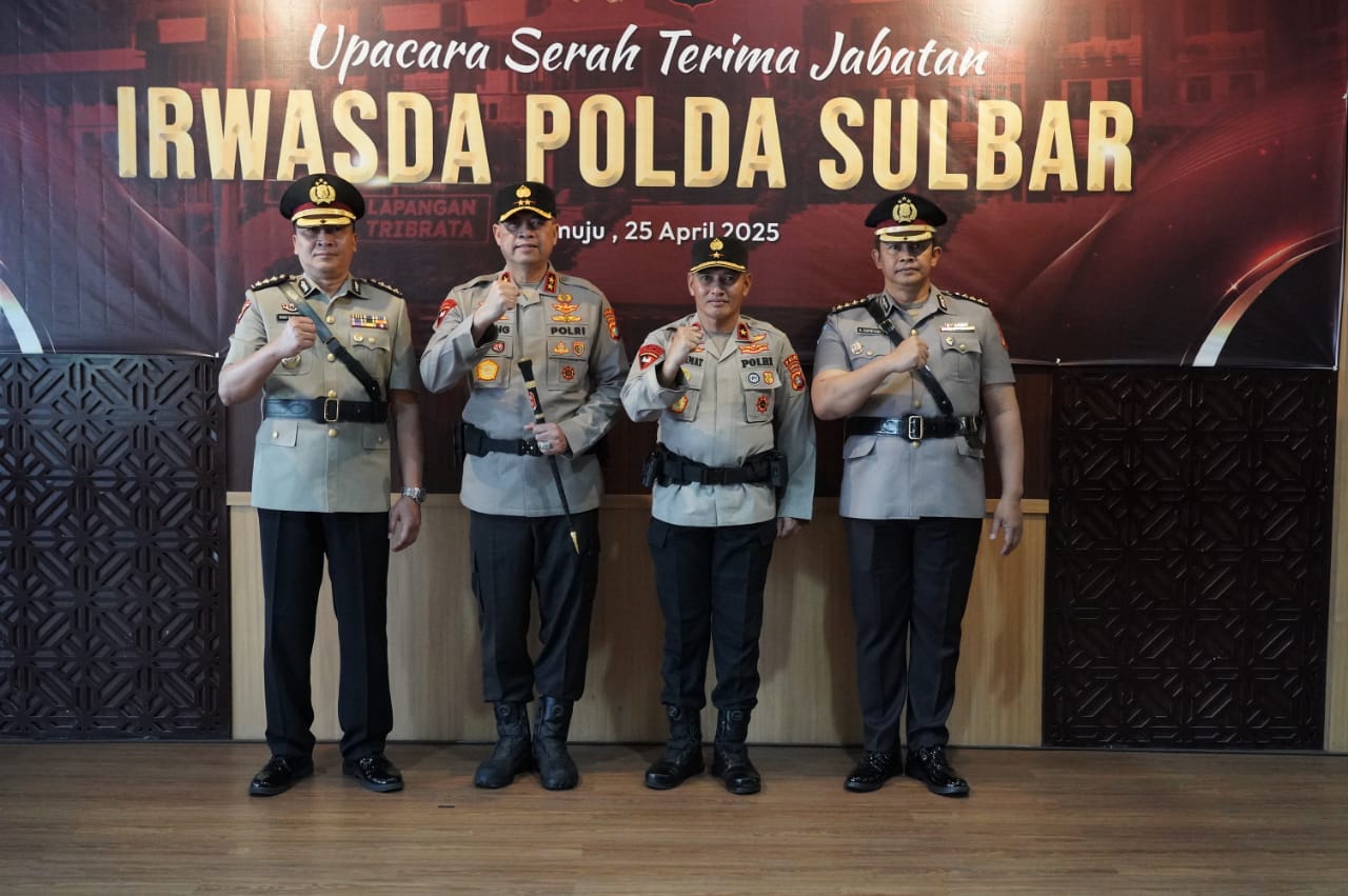 Mamuju, Potretrakyat.com; — Kapolda Sulbar Irjen Pol Adang Ginanjar dalam kegiatan serah terimah jabatan (Sertijab) melantik pejabat baru Irwasda, Jumat (25/4/25) di lobi utama Mapolda Sulbar.