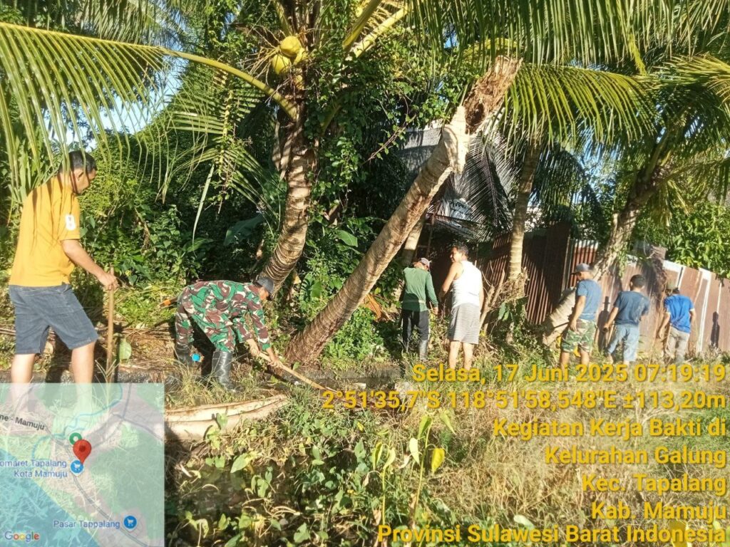 Mamuju, Potretrakyat.com; – Dalam upaya mendukung ketahanan pangan dan meningkatkan hasil panen masyarakat, Personel Koramil 1418-02/Tapalang melaksanakan karya bakti pembersihan saluran air di Kelurahan Galung, Kecamatan Tapalang, Kabupaten Mamuju. Selasa (17/6/2025).