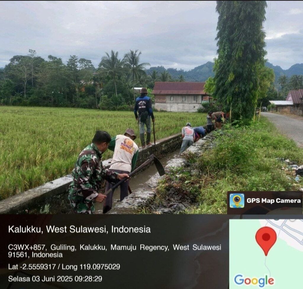 Mamuju, Potretrakyat.com; – Sebagai bentuk kepedulian terhadap ketahanan pangan dan kesejahteraan petani, personel Koramil 1418-03/Kalukku bersama masyarakat Desa Guliling, Kecamatan Kalukku, Kabupaten Mamuju, melaksanakan karya bakti pembersihan saluran air pada hari Selasa (3/6/2025).
