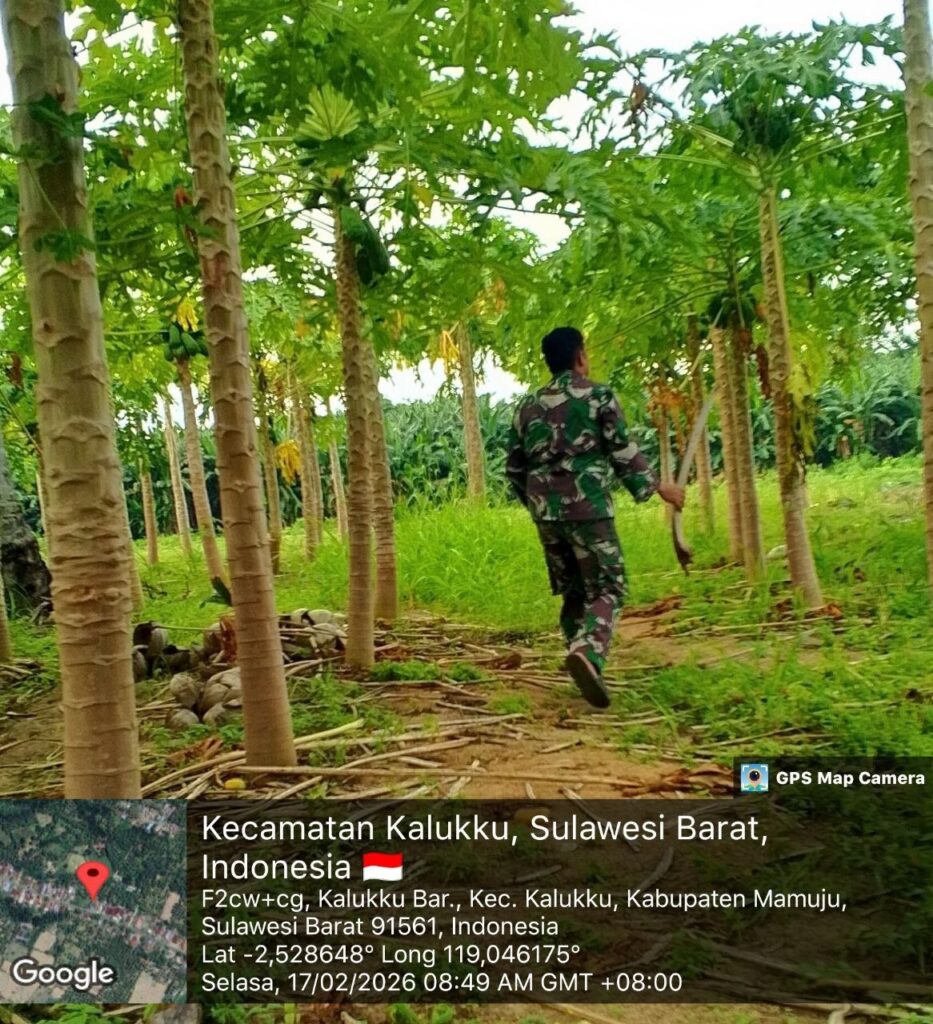 Mamuju, Potretrakyat.com; – Dalam rangka mendukung program ketahanan pangan nasional, Babinsa Koramil 1418-03/Kalukku jajaran Kodim 1418/Mamuju melaksanakan kegiatan pemeliharaan lahan ketahanan pangan milik Korem 142/Tatag yang dikelola oleh Kodim 1418/Mamuju. Kegiatan ini dilaksanakan secara rutin sebagai bentuk komitmen TNI AD dalam menjaga ketersediaan dan keberlanjutan produksi pangan di wilayah. Selasa (17/2/2026).