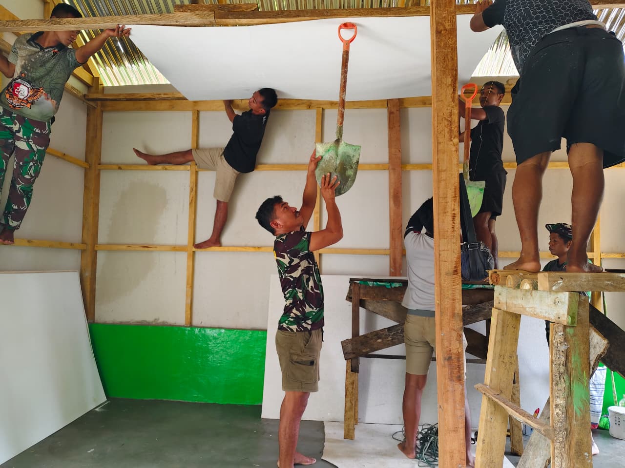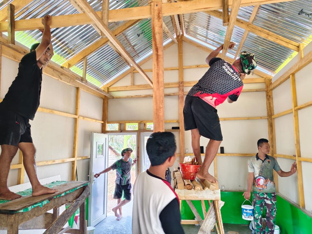 Rumah berukuran 4 x 6 meter tersebut saat ini hampir rampung seratus persen. Pemasangan pintu dan jendela telah selesai, dinding sudah dicat, serta bagian atap berdiri kokoh. Pekerjaan akhir difokuskan pada pemasangan plafon dan perapian lantai untuk menyempurnakan bangunan sebelum diserahkan kepada pemilik.