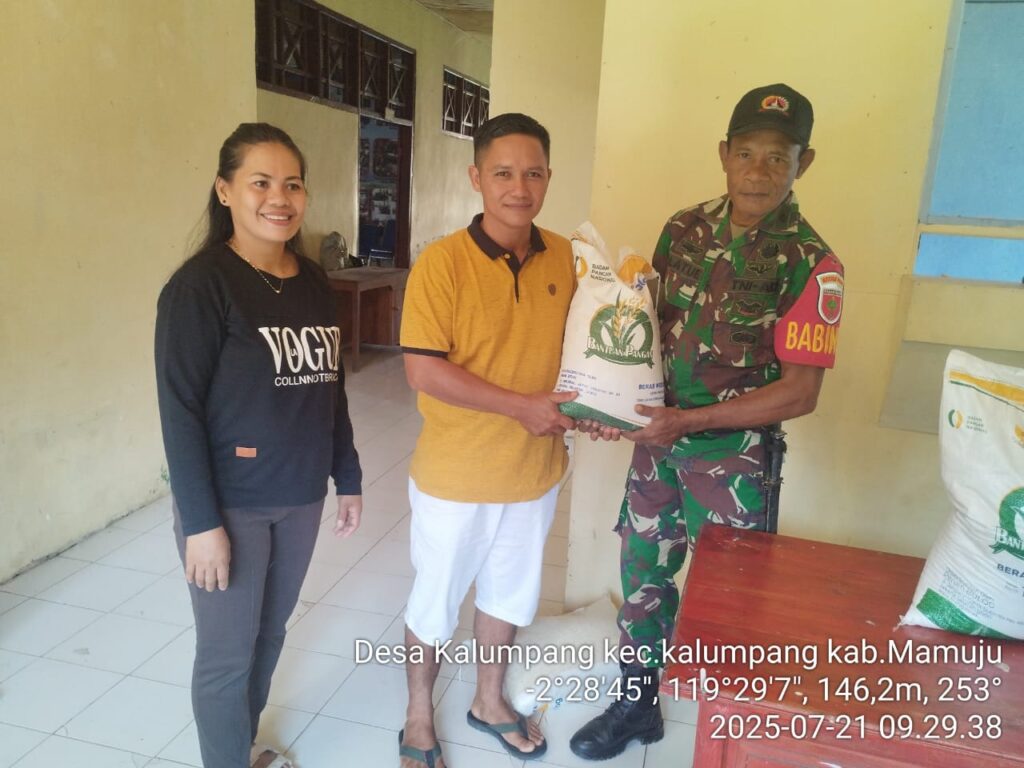 Mamuju, Potretrakyat.com; — Komando Distrik Militer (Kodim) 1418/Mamuju menunjukkan komitmennya dalam mendukung program ketahanan pangan nasional dengan melakukan pendampingan penyaluran bantuan cadangan pangan beras pemerintah, kepada keluarga Penerima bantuan Pangan (PBP) di wilayah Kecamatan Kalumpang, oleh Badan urusan logistik (Bulog) Mamuju dan Dinas Ketahanan Pangan Kabupaten Mamuju, senin 21 Juli 2025.
