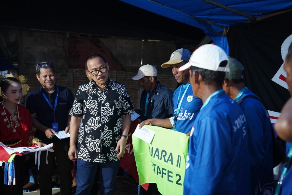 Penyerahan hadiah kepada juara Etape II rute Pantai Pamboang – Banua Sendana. Sebanyak enam perahu dari dua grup menerima total hadiah Rp6,4 juta, ditambah bendera juara sebagai simbol prestasi.