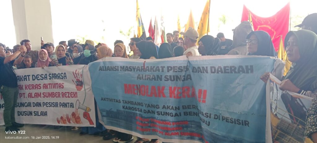 Mamuju, Potretrakyat.com; – Ratusan masyarakat Pesisir daerah aliran geruduk kantor DPRD Sulbar dan menolak keras aktivitas tambang yang akan beroperasi di Pesisir Karossa dan Benggaulu, Kabupaten Mamuju Tengah, Kamis (16/1/2025).