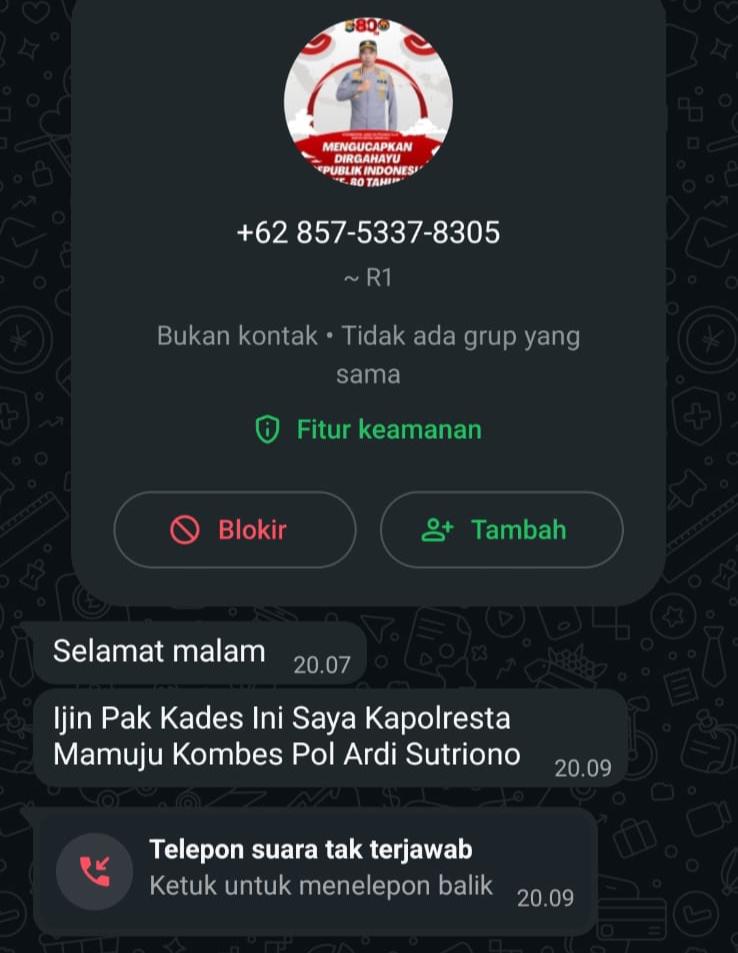 Mamuju, Potretrakyat.com; — Modus penipuan dengan mencatut nama pejabat kepolisian kembali terjadi. Kali ini, pelaku menggunakan nama dan foto profil Kapolresta Mamuju, Kombes Pol Ardi Sutriono, untuk melancarkan aksinya.