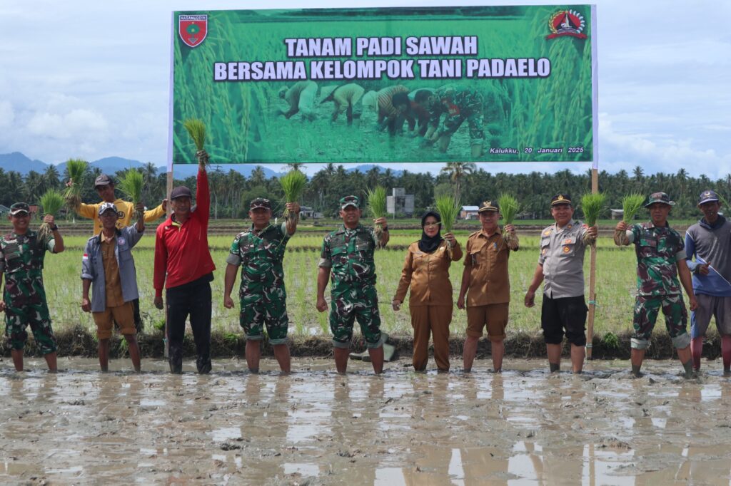 Mamuju, Potretrakyat.com; – Dalam rangka mendukung program ketahanan pangan dan menghidupkan kembali lahan tidur, Danrem 142/Tatag, Brigjen TNI Hartono, S.I.P., M.M., bersama Dandim 1418/Mamuju, Kolonel Inf Andik Siswanto, S.I.P., M.I.Pol., melaksanakan kegiatan tanam padi sawah bersama kelompok Tani Padaelo di Desa Beru-beru, Kecamatan Kalukku, Kabupaten Mamuju, Provinsi Sulawesi Barat, pada Senin (20/1/2025).